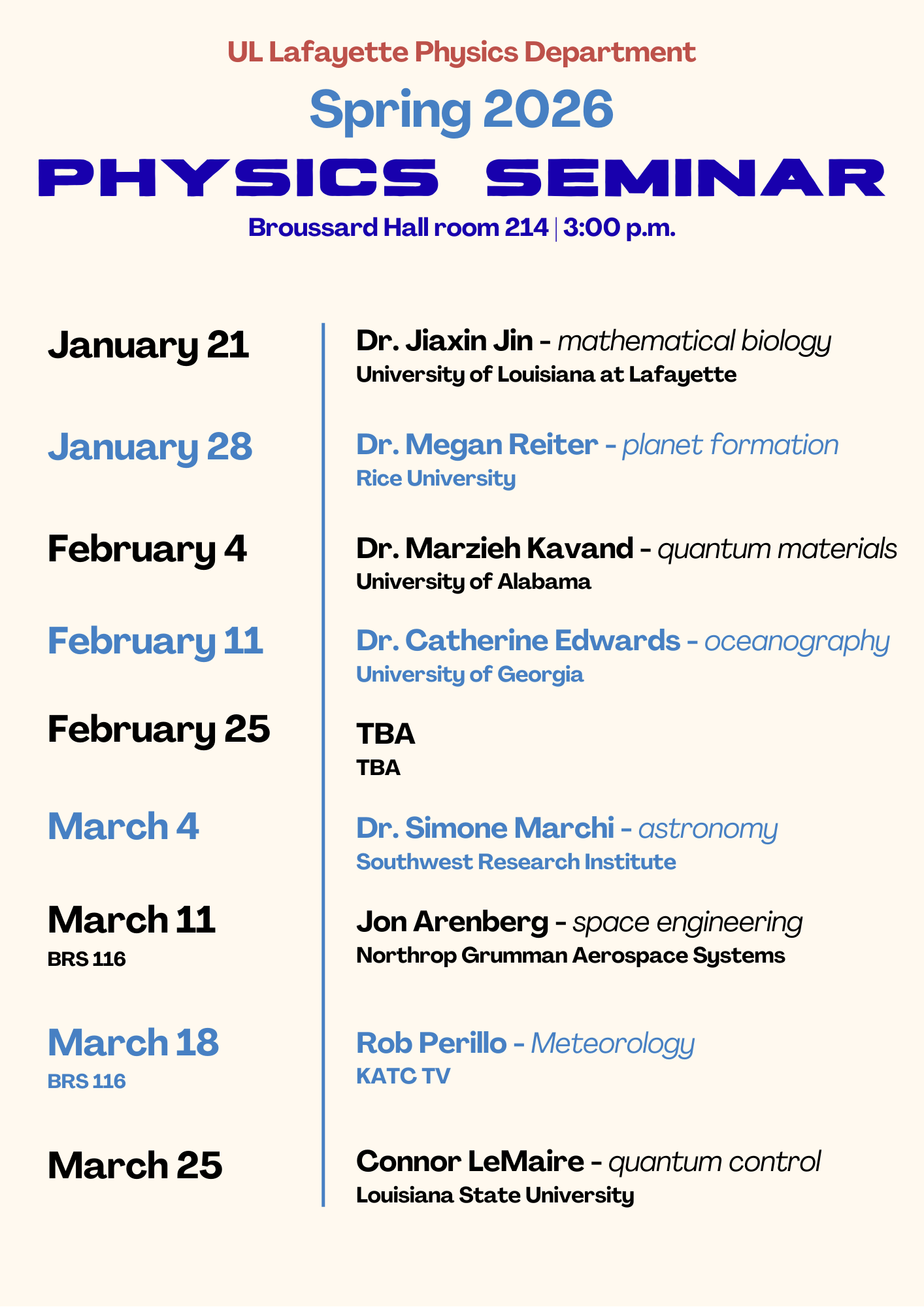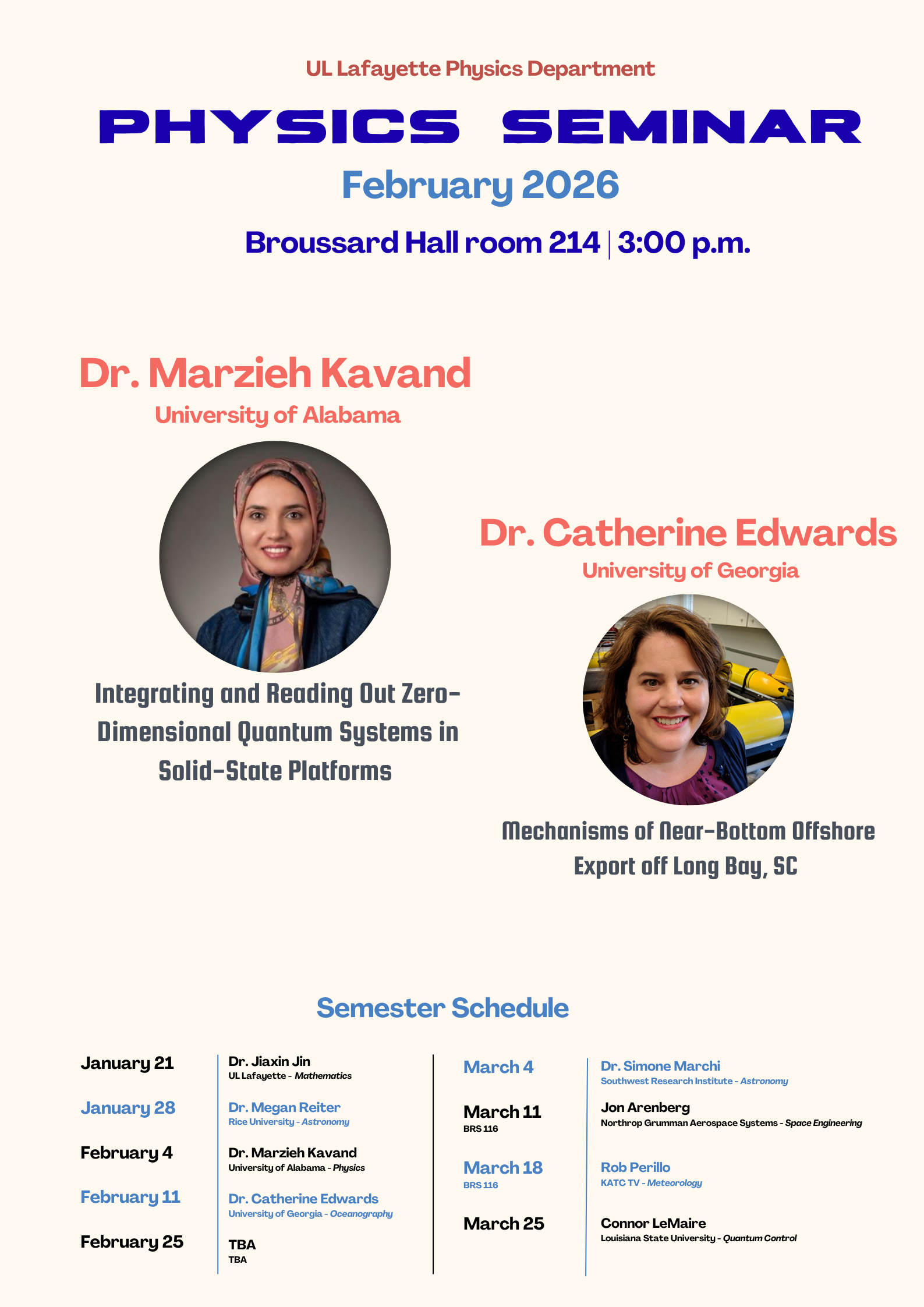 SPRING 2026 SEMINARS Mon, 08/25/2025 - 4:44pm Top Stories New paper co-authored by faculty member sheds light on laser control of nanometer magnetic structures Ultrafast laser switching of nanoscopic magnetic configurations Read More ➝ Physics faculty member contributes to understanding the near absence of nitrogen from Earth's mantle Read More ➝ Congratulations to our Summer Graduates! Bachelor of Science David Silva Master of Science Read More ➝ Click here for the detailed physics seminar list. SHARE THIS |